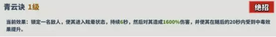 👉描述:锁定一名敌人,使其进入眩晕状态,持续6秒,然后对其造成1600%伤害,并使其在随后的20秒内受到中毒效果提升。