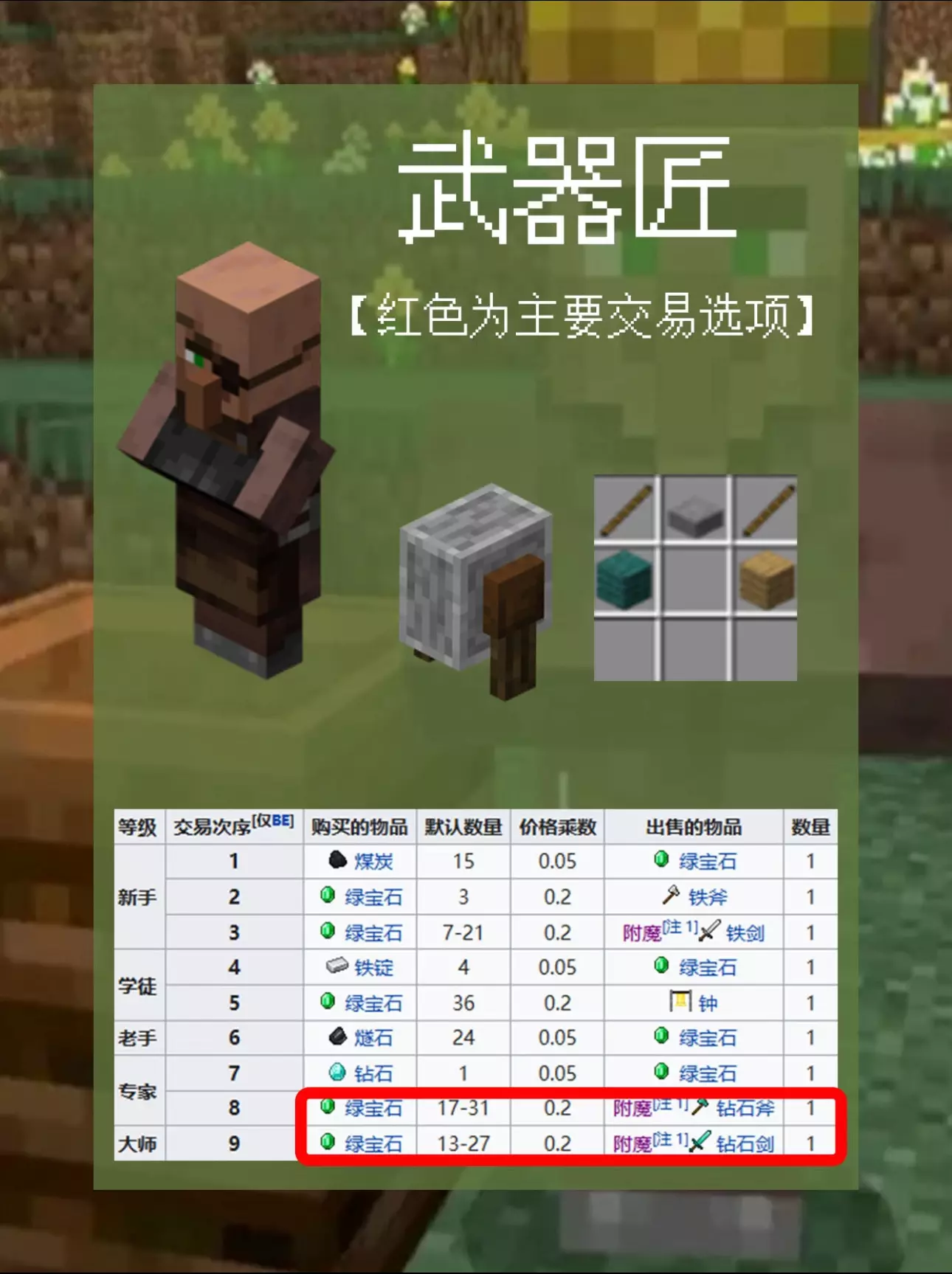 武器匠(砂轮) 核心交易:铁斧、附魔钻石剑/斧、钟。 版本差异:基岩版中,铁斧需专家级解锁,Java版为学徒级。 #MC趣事