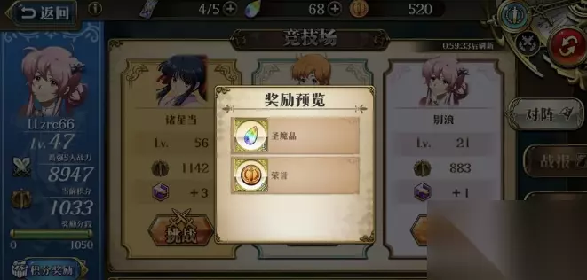 2、我们也可以通过游戏的竞技场获得挑战点数,竞技场模式中,我们可以选择敌人进行战斗,自动战斗可以获得双倍积分。