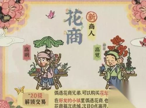 1、花商的刷新时间是随机的,但是离开时间是固定的,如果在玩家的城市中出现了花商,一般是到次日的0点就会离开; 2、花商是用来和玩家们交易的,我们可以通过花商来购买花坛,装饰我们的城市; 3、花商的开启条件是玩家的游戏等级到达20级及以上才可以; 4、花商在玩家的城市中没有刷新也没关系,我们可以通过去好友的城市中寻找花商,也可以进行交易的; 5、花商是两个人,是两兄弟,一个叫高明、一个叫高觉。
