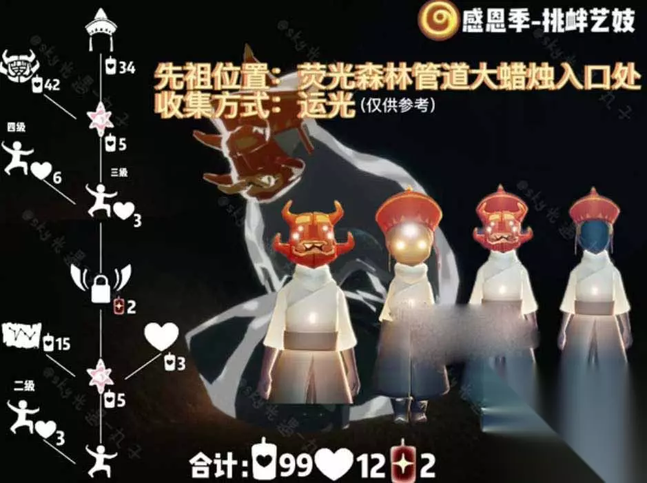 2、先祖的兑换列表图如下图所示,面具42蜡烛,帽子34蜡烛、乐谱15蜡烛,兑换全部物品需要准备99蜡烛、12爱心2升华蜡烛。