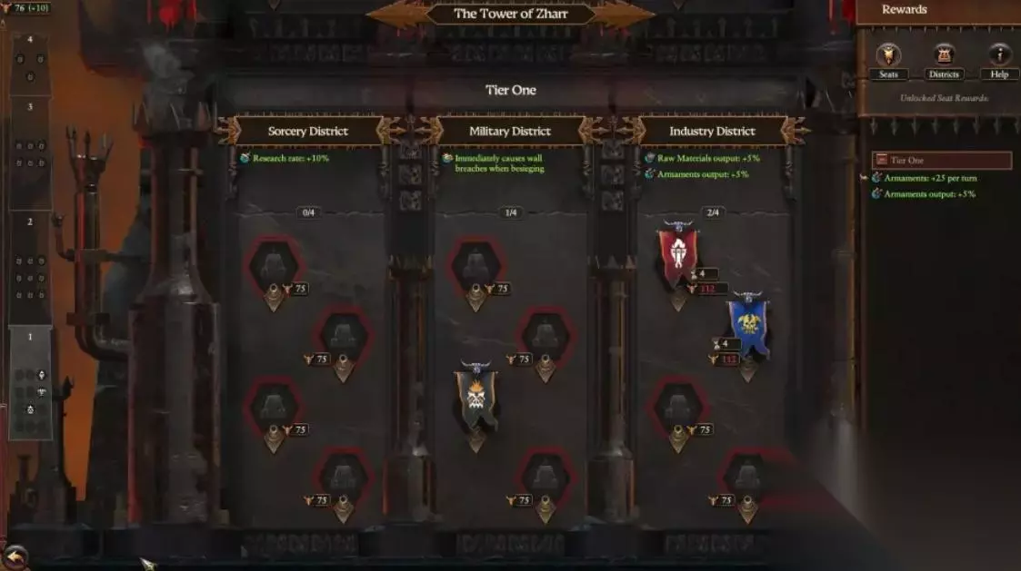 扎尔之塔高高矗立在混沌矮人的首都——扎尔·纳格隆德。这里是扎尔矮人们的政治战场,也是他们作为强大的混沌派系取得成功的关键所在。 通过争夺塔内的各个席位,混沌矮人可以获得各种各样的增益与奖励。而在多人模式中,这个机制也让派系之间除了战争以外又多了一种竞争方式,通过分区的形式让战役中的合作更加高效。 分区能够为整个混沌矮人文化区提供加成,鼓励大家为了所有人的共同利益建设扎尔·纳格隆德。 探索各种各样的游玩风格,插手不为人知的外交事务(可能包括背后捅刀子)——扎尔之塔可以说是《Total War: WARHAMMER》目前为止最独特、最有深度、可玩性最高的机制。 战斗 与牛共舞