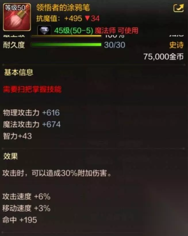 地下城与勇士M领悟者的涂鸦笔介绍 一、抗魔值 495 二、适用职业 魔法师 三、装备类型 扫把 四、基本信息 需要扫把掌握技能 物理攻击力+616 魔法攻击力+674 智力+43 五、效果 攻击时可以造成30%的附加伤害 攻击速度+6% 移动速度+3% 命中+195
