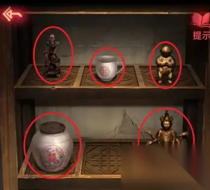 22、在场景三中点击线索,可以获得油灯,可以使用蜡烛把油灯点着。 23、在场景三左边的架子最下面,可以点击获得签字笔。 24、点击阅读书可以获得半张相片,根据反字日记右上方的图案设计进行如下物品的分类。