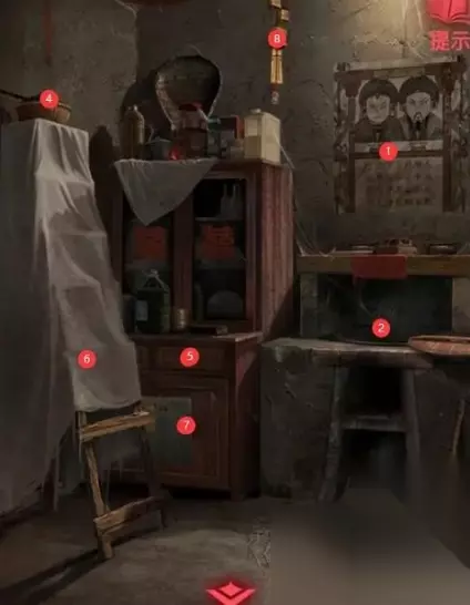 3、在这里有一个锁,密码根据图案设计和数字来探索。 4、密码是纸新娘,树,月亮,佛像,打开之后,里面有一块枣糕。 5、在第二个场景中有如下图所示的8个可以点击的线索。