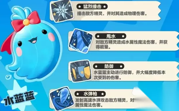 水蓝蓝: 水系元素精灵,同为御三家之一,可以进化成波波拉、水灵,特性都是在使用水系技能的时候所有技能消耗减1点。水蓝蓝造型非常可爱,经常漂浮在水面,头顶上还有一个好看的红色蝴蝶结,不在水中的时候身上也能看到一层透明的液体薄膜。进化成波波拉后总是随着带着一颗球,身旁还环绕着特殊的元素触手,最终型水灵附近的水元素汇集得更多了,甚至还将刚孕育出来的胚胎摆在头顶,水灵可以将水元素喷射出去,冲击力极强。