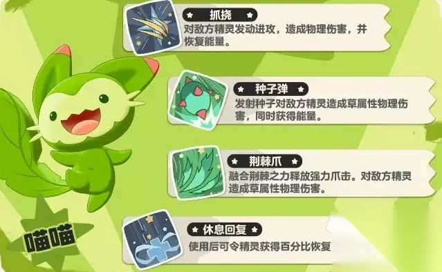 喵喵: 草系的猫型宠物,洛克王国世界宠物图鉴的御三家之一,可以进化成喵呜、魔力猫,宠物进化自身的特性并不会改变,课题技能石会变化,喵喵的特性是使用草系技能的时候可以回血15%。喵喵喜欢摇晃着尾巴,非常可爱,受到惊吓的时候更是会快速逃跑。虽然胆子很小,但有时候也非常调皮。进化后芭蕉叶形状的尾巴直接变成了2条,胆子也变肥了不少,会朝着对手吐舌头。进化到魔力猫之后体型更大了,尾巴也来到了3条,直接用巨大身体就可以冲垮对手,不过最终型性格方面反而是变得温和了不少。