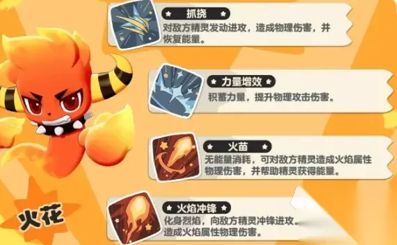 火花: 洛克王国手游精灵图鉴中最具代表性的火系精灵,特性也是增强自身伤害的,释放火系的技能后威力提升。火花可以进化成焰火、火神,体型越来越大,也是更有派头了。火花的造型就是一团有着恶魔角的小火花,别看个头小,勇敢无畏,可以熟练的使用火元素,虽然有时候有点小冒失,但依旧是玩家最值得信赖的伙伴。进化成焰火后长出了一对大翅膀,但似乎并不是用来飞的,双手的轮廓也更加明显了,可以使用更为强力的火焰攻击。火神则是非常强大的火焰精灵,只是靠近就能感受到它的温度,脖子上的巨大项圈可以约束它,如果没有的话,它的火焰可是会暴走的哦!