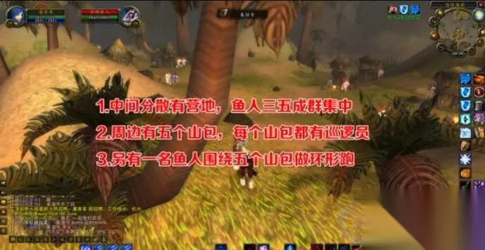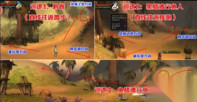三、注意事项 1.要了解外围巡逻小怪的警戒范围 这里是最考验预判能力的地方,关键是看好巡逻怪的位置。A怪的时候,走位非常重要。在进半岛的西侧,有个三岔路口,西北方向是贫瘠之地,路上有个巡路的总钻风叫做刺脊,他衣着光鲜,沿直线往返踱步,颇有领导风范。东北方向是棘龄城,路上有个巡路的小钻风叫做黑鳍滩行鱼人,他沿直线往返疾跑,一路屁股冒烟、脚后跟磕后脑勺,尽显龙套本色。南侧是通往塞拉摩的路,只有几只慢腾腾的老龟,相对比较安全。需要注意的是,总钻风和小钻风的巡逻责任区域以那棵树为分界线,到达后稍停就会返回。A怪时要特别注意,尽量别让这两路人马参战。
