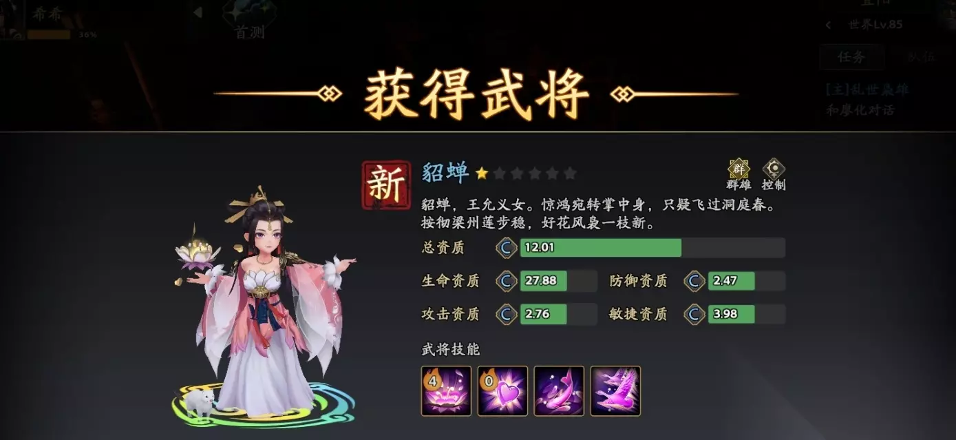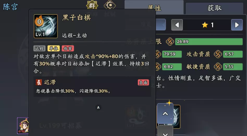主动技:黑子白棋 效果:单体90%攻击+80伤害,30%概率挂【迟滞】。 定位:单点补控技能,优先对敌方主C释放,例如张辽、吕布,限制其爆发。