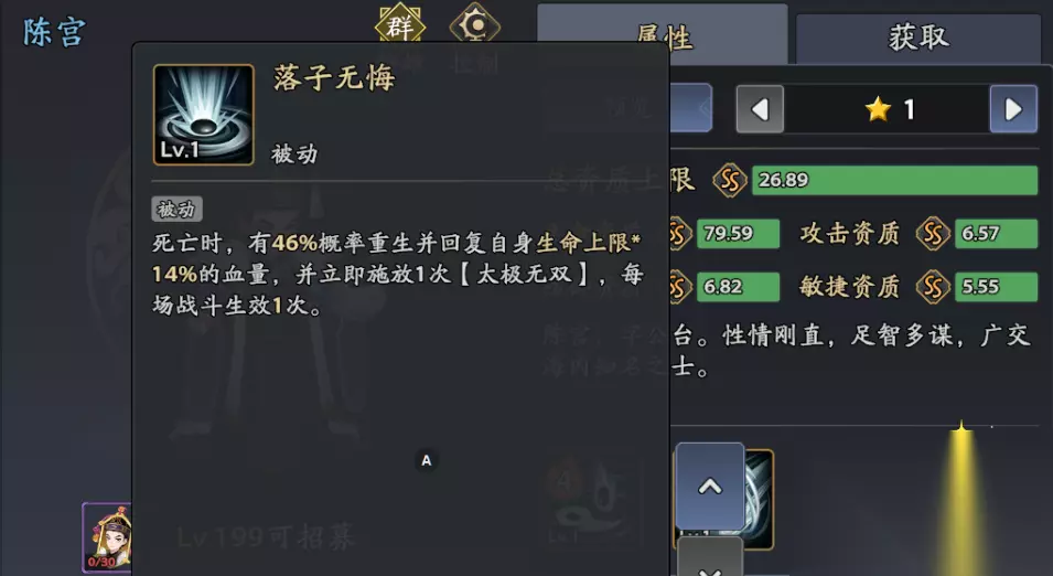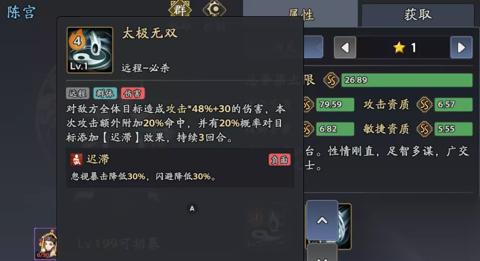 二、陈宫技能全解析与加点策略 核心技能机制 大招:太极无双 效果:全体48%攻击+30伤害,20%概率挂【迟滞】(持续3回合),附加20%命中提升。 群体控场启动技,命中提升可抵消敌方闪避属性,确保【迟滞】命中率;配合被动【背却苍天】,下一回合将【迟滞】升级为【冰冻】,形成控场链。