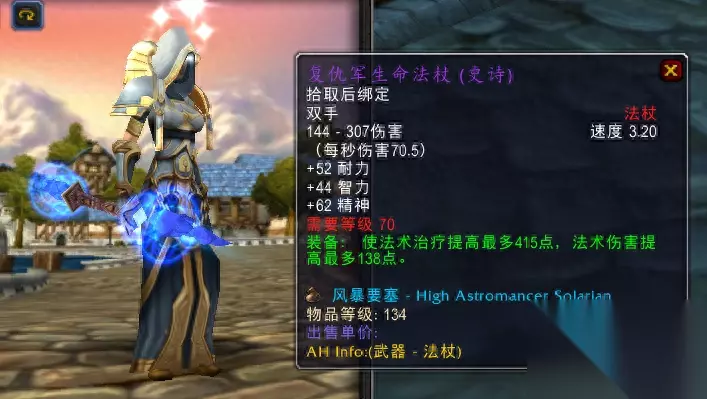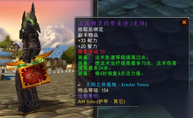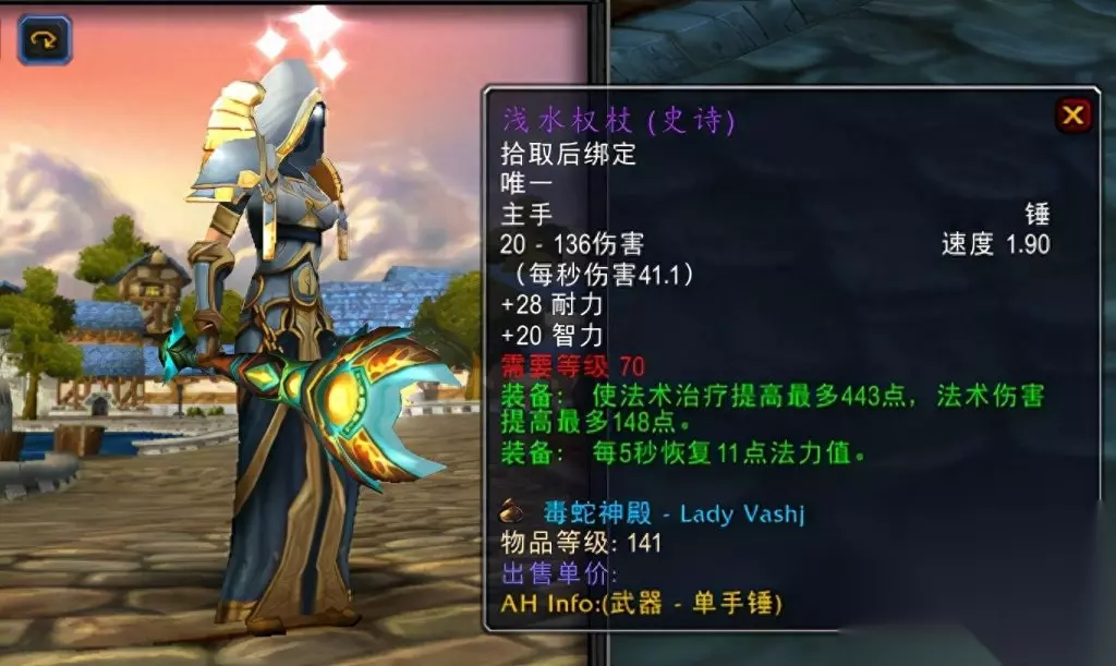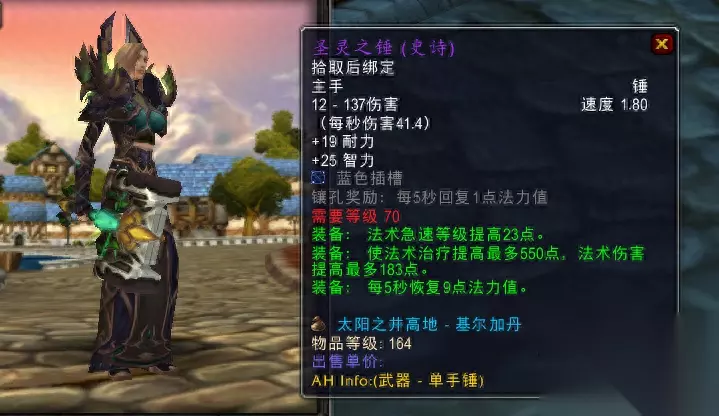 与塔拉波的水晶之塔配合的副手装备是净化节杖,阿克蒙德掉落的这个副手也非常优秀,和塔拉波的水晶之塔相得益彰。 终极选择-圣灵之锤+上层精灵的赞美诗 最后我们再聊聊太阳井治疗武器的选择。