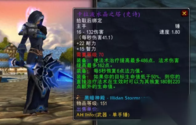 真正的毕业装还是基尔加丹掉落的圣灵之锤,它比执政官之锤多了一条急速属性,总体治疗能力和卡拉波水晶之塔差不多,玩家可以根据自己的实际需求选择。