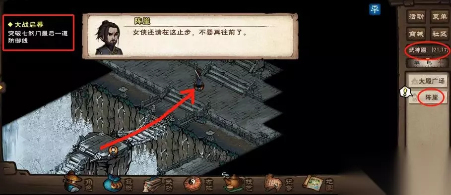然后最后一道防线继续往北走到(21,17),打败陈崖、李雷云就可以进入武神殿了。