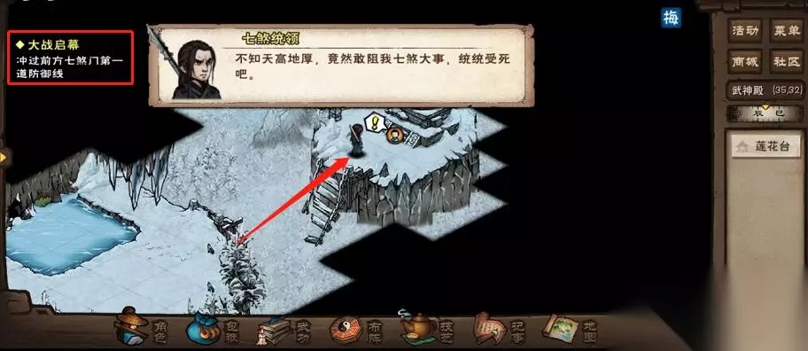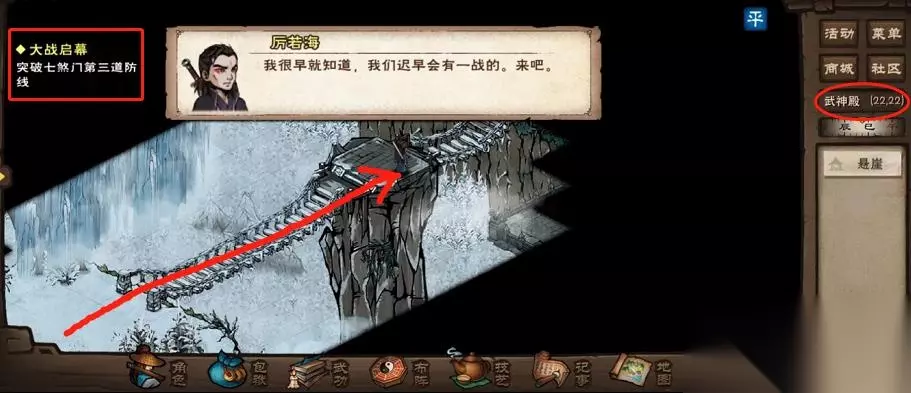 武神殿门口(35,32)第一道防线需要打败一些七煞门将领,难度不高,然后原地一番对话后,触发第二道防线。