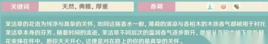 旅途: 薄荷➕粉花➕木头 茉洁草的花语为纯净与真挚的关怀,如同这瓶香水一般,薄荷的清凉与香柏木的木质香气都被用于衬托茉洁草本身的芬芳。随着时间的流逝,茉洁草不同层次的温润香气逐步散开,像把从花园中摘下的新鲜花束捧在怀中,愿你天天开心,这便是对在路上的你的最真挚的关怀。