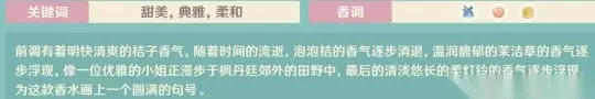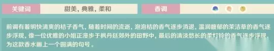 橘色田野: 深蓝花➕粉花➕橘子 前调有着明快清爽的桔子香气,随着时间的流逝,泡泡桔的香气逐步消退,温润馥郁的茉洁草的香气逐步浮现,像一位优雅的小姐正漫步于枫丹廷郊外的田野中,最后的清淡悠长的柔灯铃的香气逐步浮现,为这款香水画上一个圆满的句号。