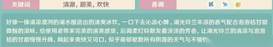 注意:!!!名字后带高级的香水,材料和普通的一样,只不过用的材料是两个材料合成为的高级材料! 先将一个材料拖动到上面的三个框中的一个,再拖动同样的材料,两者重叠,合成高级材料 微光: 深蓝花➕浅蓝花➕橘子 好像一捧清凉凛冽的湖水酿造出的清爽冰饮,一口下去沁凉心脾。湖光铃兰辛凉的香气配合泡泡桔甘甜微酸的滋味,给使用者带来完美的清爽感受,后调柔灯铃散发着淡淡的芳香,让湖光铃兰的清凉与泡泡桔的甘甜慢慢升腾,闻起来爽快又可口,似乎能够驱散所有阴霾的天气与不愉快的心情~!来,干杯!