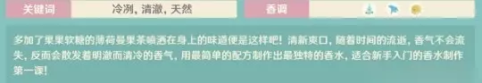 夏日童话: 薄荷➕浅蓝花➕橘子 多加了果果软糖的薄荷曼果茶喷洒在身上的味道便是这样吧!清新爽口,随着时间的流逝,香气不会流失,反而会散发着明澈而清冷的香气,用最简单的配方制作出最独特的香水,适合新手入门的香水制作第一课!