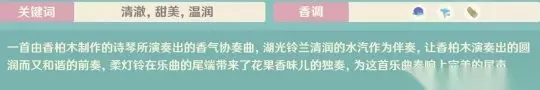 骑士的践礼: 深蓝花➕浅蓝花➕木头 一首由香柏木制作的诗琴所演奏出的香气协奏曲,湖光铃兰清润的水汽作为伴奏,让香柏木演奏出的圆润而又和谐的前奏,柔灯铃在乐曲的尾端带来了花果香味儿的独奏,为这首乐曲奏响上完美的尾声。