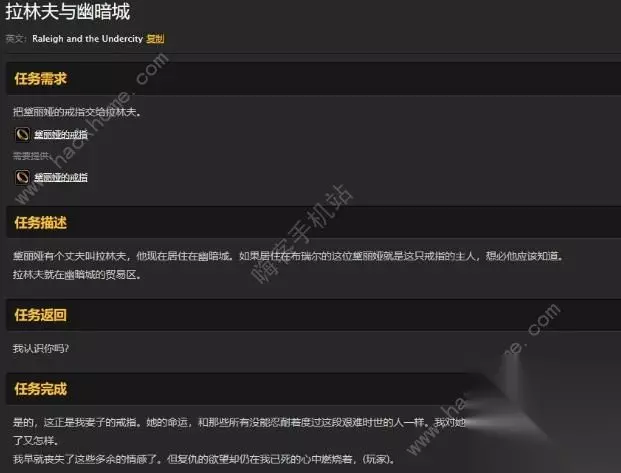 任务具体要求 治安官拉弗伦找到了黛丽娅的丈夫,他的名字叫拉林夫。 他居住在幽暗城的贸易区,玩家可以去找到他并且把戒指交给他。 看看他最后的反应如何。