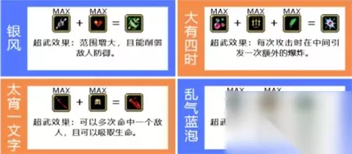 无超武的特殊武器:骨头、樱桃炸弹、推车、英华大落、圣徒精华(红白蛋)、无双盛典 总而言之呢,超武的合成条件其实并不算很难,一般最多需要三种素材就可以合成,大家如果不知道怎么选择超武的话,可以根据超武的效果来进行选择哦。 以上就是小编为大家准备的吸血鬼幸存者合成表2024攻略 吸血鬼幸存者合成攻略的全部内容,想要了解更多的攻略的小伙伴可以持续本站。