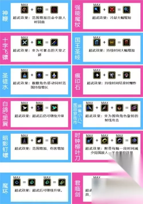 吸血鬼幸存者合成表2024攻略是什么?游戏融合了哥特式恐怖和肉鸽元素。玩家需要一次又一次的做出选择,让自己的角色越来越强大,突破怪物的围攻。很多朋友还不知道如何合成一些武器装备。下面小编为大家分享吸血鬼幸存者合成攻略。 吸血鬼幸存者合成攻略 超武合成表图: