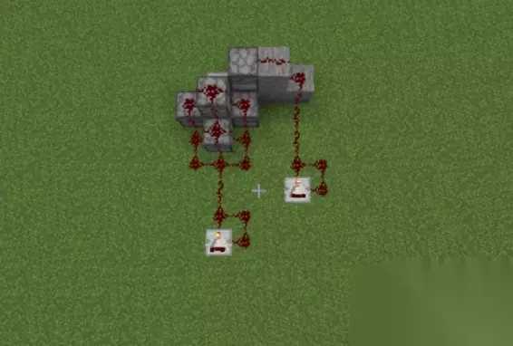 第三步:这是基本的已经完成了,我们只需把两边的红石电路连接起来就大功告成了,然后在发射器上放上TNT就可以测试下威力了。