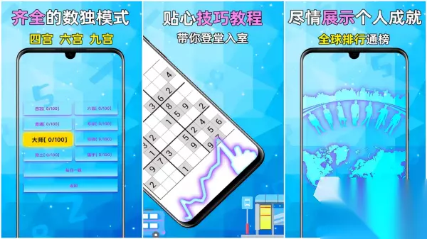 游戏为各位打造了一个有趣的数字逻辑推理小世界,在纵横交错的宫格内,会有部分已知的数字,各位需要在九九八十一格内填入1到9的数字,且保证横九竖九、以及独立的三乘三小宫格中,九个数字都不重复,极为成功。《数独谜题挑战》的整体画风干净清爽,淡雅的白紫配色,令大家可以在一种舒缓的氛围里快乐挑战填数。 高速下载 普通下载 优先233乐园APP下载 4、《全民数独》