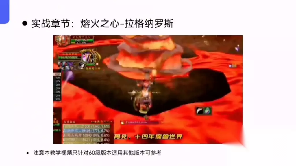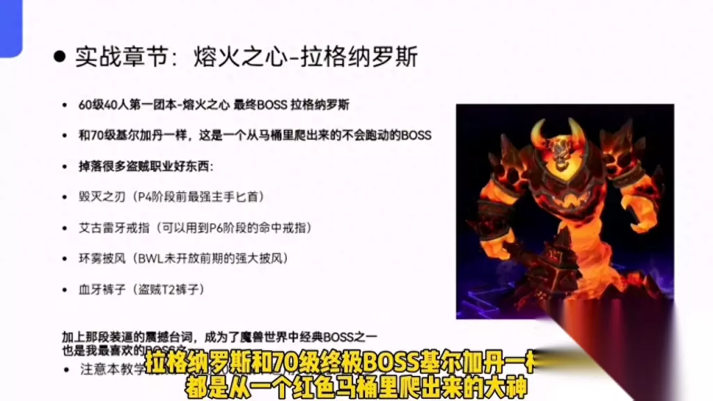 盗贼职业教学全系列。 魔兽世界永久六十版本香草时代盗贼职业PVE教学全系列。 实战章节:熔火之心-拉格纳罗斯。作者:公主牌盗贼系列。 熔火之心60级、40人第一团本也是最经典的团本之一。注意本教拉格纳罗斯和70级终极B0SS基尔加丹一样,都是从一个红色马桶里爬出来的大神。暴雪有个习惯凡是从马桶里爬出来的大神都有着各种精品掉落和经典台词。大螺丝是魔兽世界经典BOSS之一,也是我最喜欢的BOSS之一。