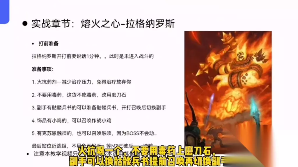 很多人认为拉格纳罗斯是个远程BOSS,适合远程攻击,近战不行。注实际上这个BOSS近战会打,依然可以甩出远程几条街。 先说一下打前准备。注站火抗喝一个,不要用毒药上磨刀石,副手可以换骷髅兵书,提前召唤再切换副手。有作战小鸡和克苏恩的触须可以在对话期间提前召唤后切换饰品。起手不用急,要成为高手首先要会淡定。