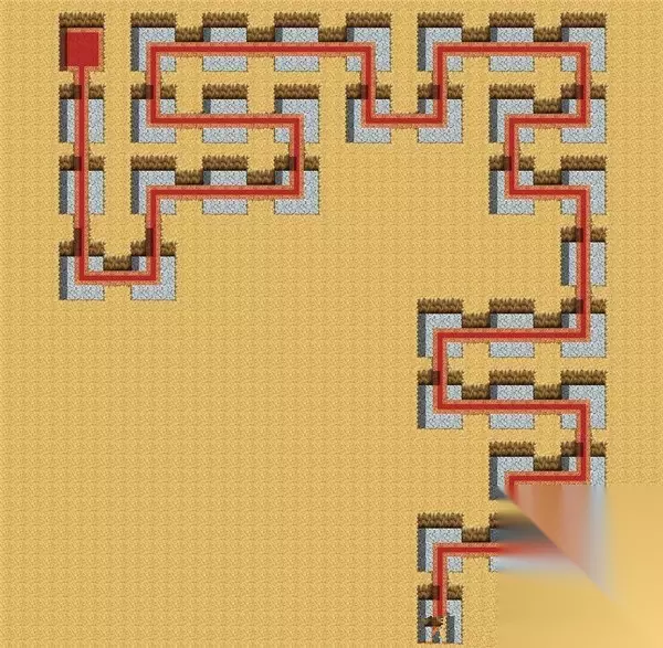如果点击屏幕左边和右边的按钮,则奎恩会旋转他的朝向,请根据指南针确定奎恩的朝向是左(西)、右(东),还是北(上)。 迷宫并非唯一,而是在固定的几个当中随机选择一个,退回主菜单再重新连接的话,可能会更换迷宫。 这里提供两种迷宫的走法。如果中途发现无法继续执行,说明随机出来的不是这个地图,请直接关闭游戏退回主菜单,重新连接以重开谜题。从原点起: 第一种:下下下右上右右上左左上右右右下右上右右下左下右下下左左下右右下左下左下 如果看不明白这一串方向代表了什么,请看下方的简略RM地图。