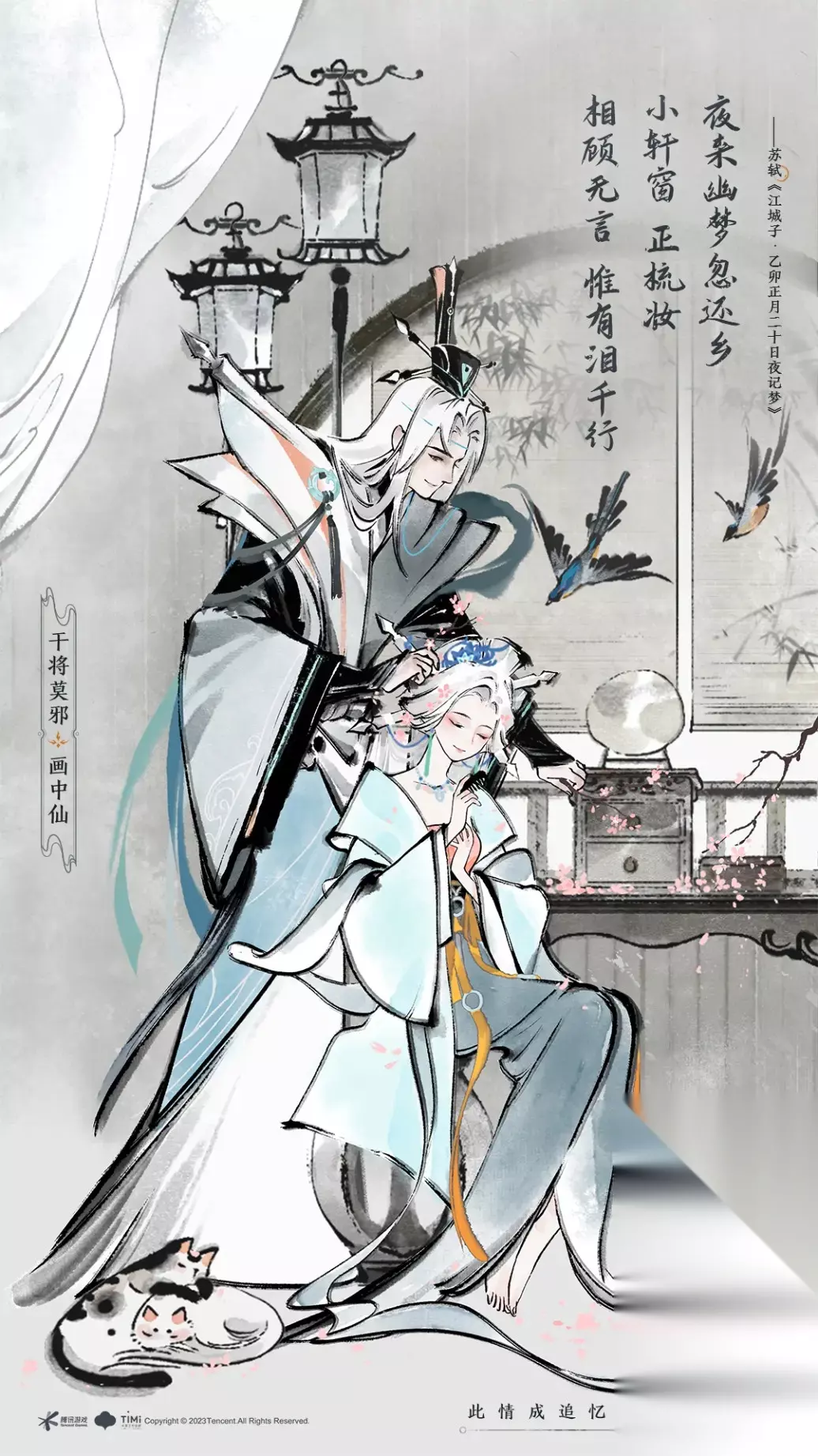 《王者荣耀》干将莫邪画中仙皮肤价格介绍 售价1788点券 首周1430点券 干将莫邪-画中仙上架 万物唯有相思苦,鸳鸯只在画中仙!以传统民间志异传说为灵感,将干将莫邪设计为一对跨越生死分离,最终以画为媒、双宿双飞的画仙。局内回城、待机/行走动作展现出二人恩爱相处的点滴,传颂真挚感人的夫妻情谊;特效设计对水墨国画中写意的山、水、鱼、鸟元素进行了奇幻浪漫的演绎,丰富了技能轨迹、受击反馈、控制消散等视效。 上架时间:3月3日0:00-5月3日23:59 品质:传说限定 价格:1788点券(首周1430点券) 拥有好运60卡的玩家还可享皮肤超值优惠哦~ 解锁皮肤可获得皮肤专属头像框