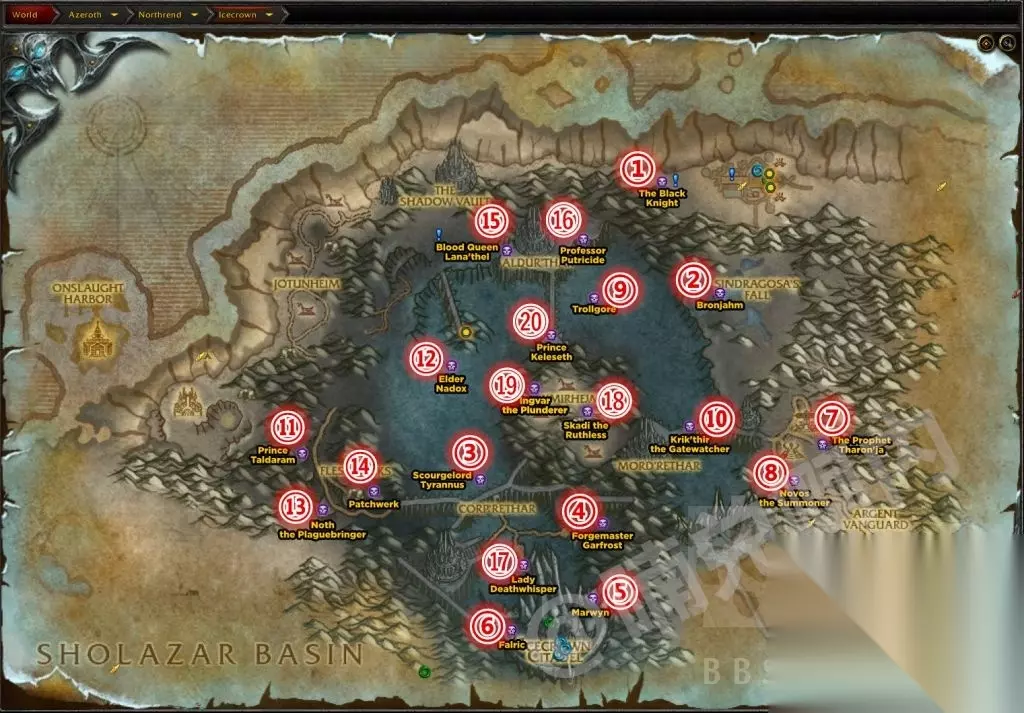 他是刷新顺序排第2的 你打开北极地图发现现在是排第20的凯雷塞斯王子 那说明还要等40分钟才刷布隆亚姆 你打开北极地图发现现在是排第14的帕奇维克 那说明还要等4小时才刷布隆亚姆 附精英名字: 1.The Black Knight 黑骑士 2.Bronjahm 布隆亚姆 (灵魂熔炉) 3.Scourgelord Tyrannus 泰兰努斯 (矿坑) 4.Forgemaster Garfrost 加弗斯特(矿坑) 5.Marwyn 马维恩(倒坦大厅 下同) 6.Falric 法瑞克 7.The Prophet Tharon’ja 萨隆亚 (达克萨隆要塞 下同) 8.Novos the Summoner 诺沃斯 9.Trollgore 托尔戈 10.Krik’thir the Gatewatcher 看门者克里克希尔(艾卓尼鲁布) 11.Prince Taldaram 塔达拉姆王子(古王国 下同) 12.Elder Nadox 纳多克斯长老 13.Noth the Plaguebringer 瘟疫使者诺斯 14.Patchwerk 战神帕奇维克 15.Blood Queen Lana’thel 鲜血女王兰娜瑟尔 16.Professor Putricide 普崔希德教授 17.Lady Deathwhisper 亡语女士(传销!!!!) 18.Skadi the Ruthless 冷酷的斯卡迪(掉蓝元龙那个) 19.Ingvar the Plunderer 掠夺者因格瓦尔( 乌特加德城堡尾王) 20.Prince Keleseth 凯雷塞斯王子 以上是小编整理的《魔兽世界》9.0前夕稀有精英刷新位置大全,不知道大家还喜欢吗?记得点击收藏圈圈下载网,更多精彩内容实时更新。