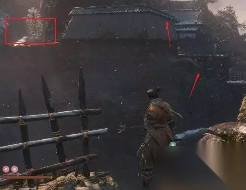 跳上到墙头,把下面的敌人忍杀后再向左边行。
