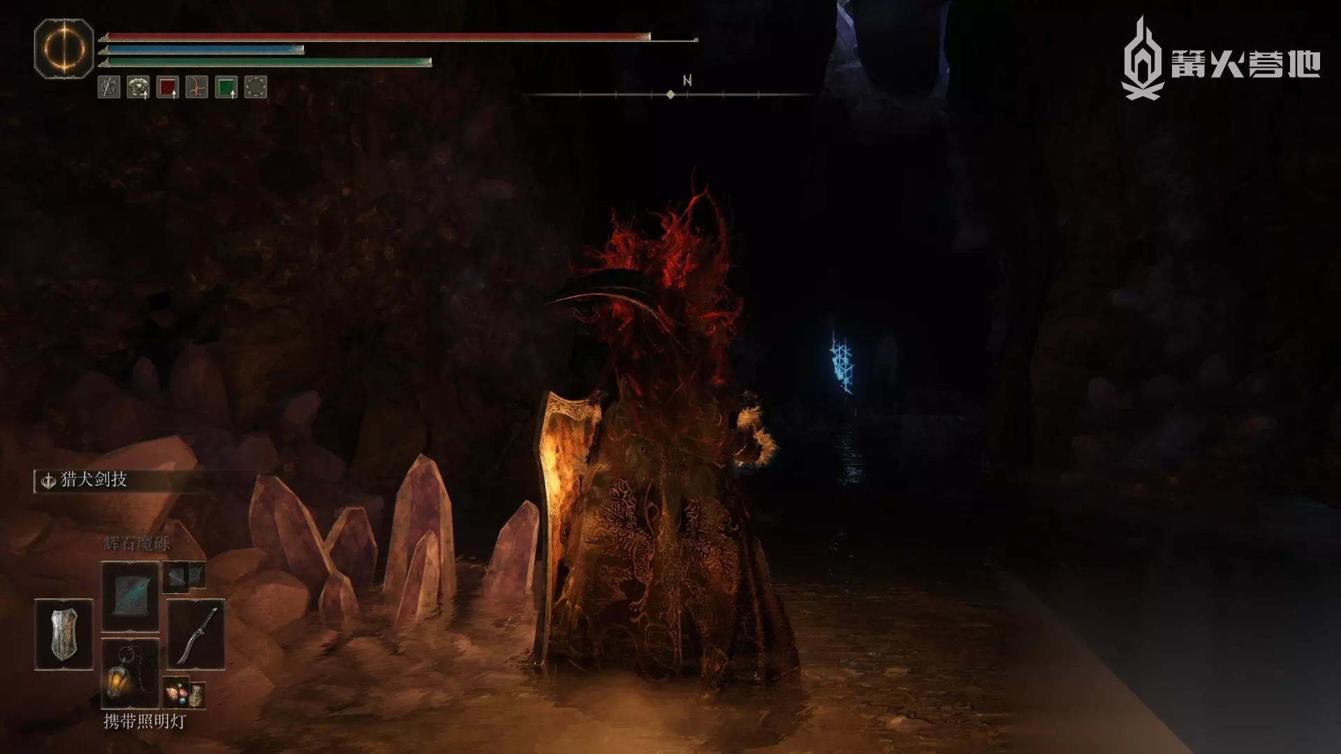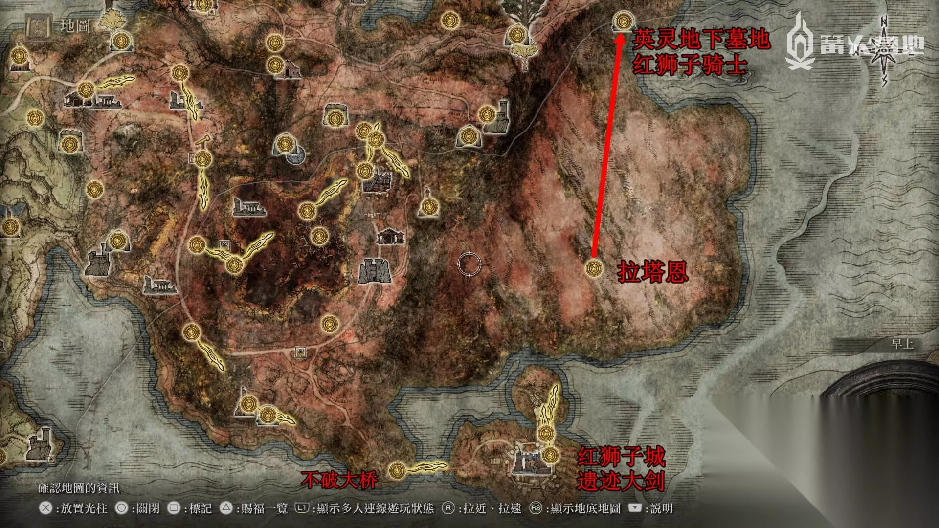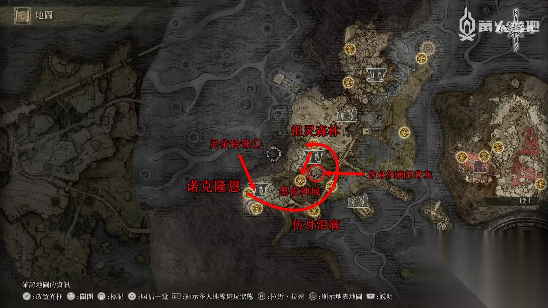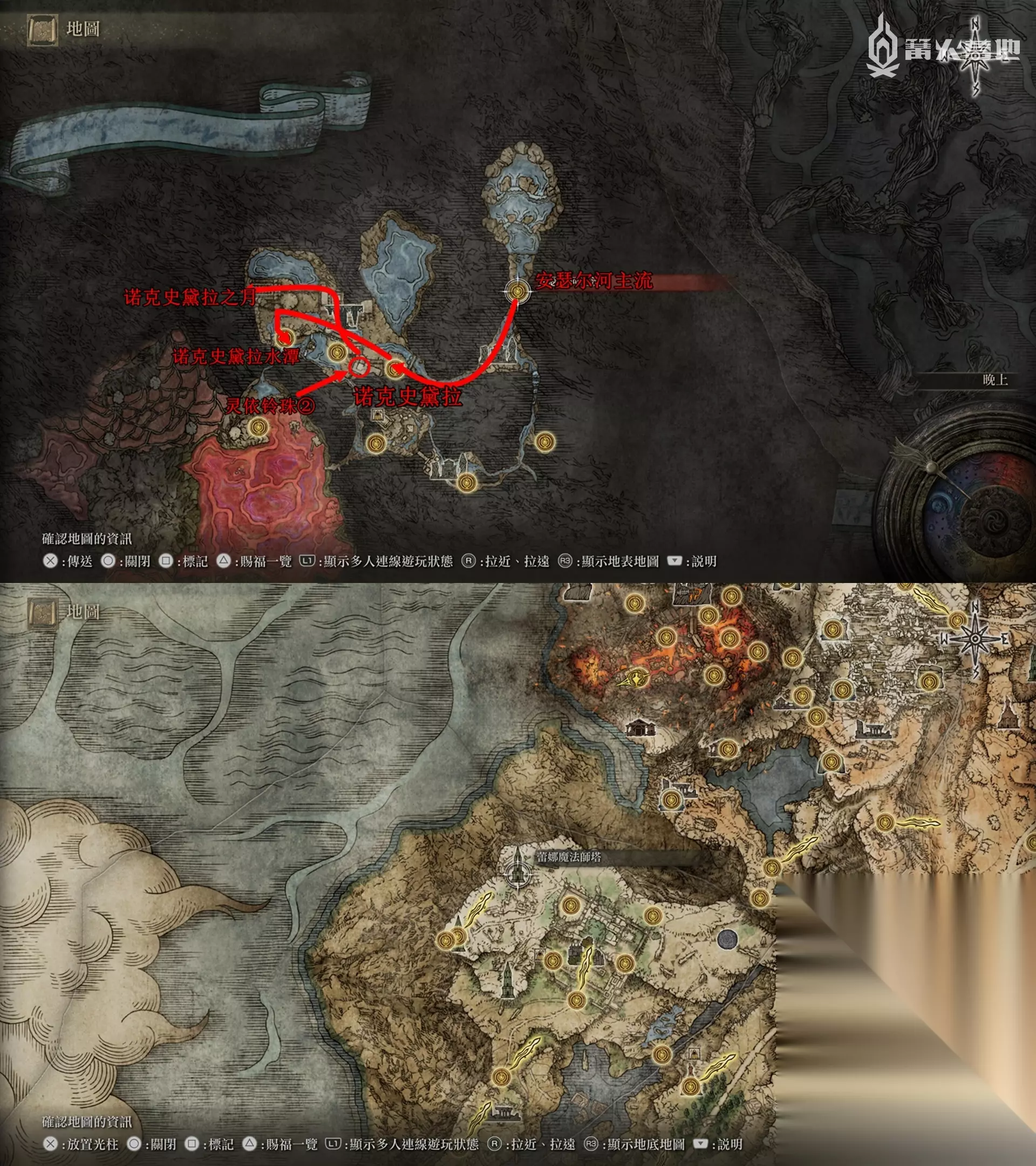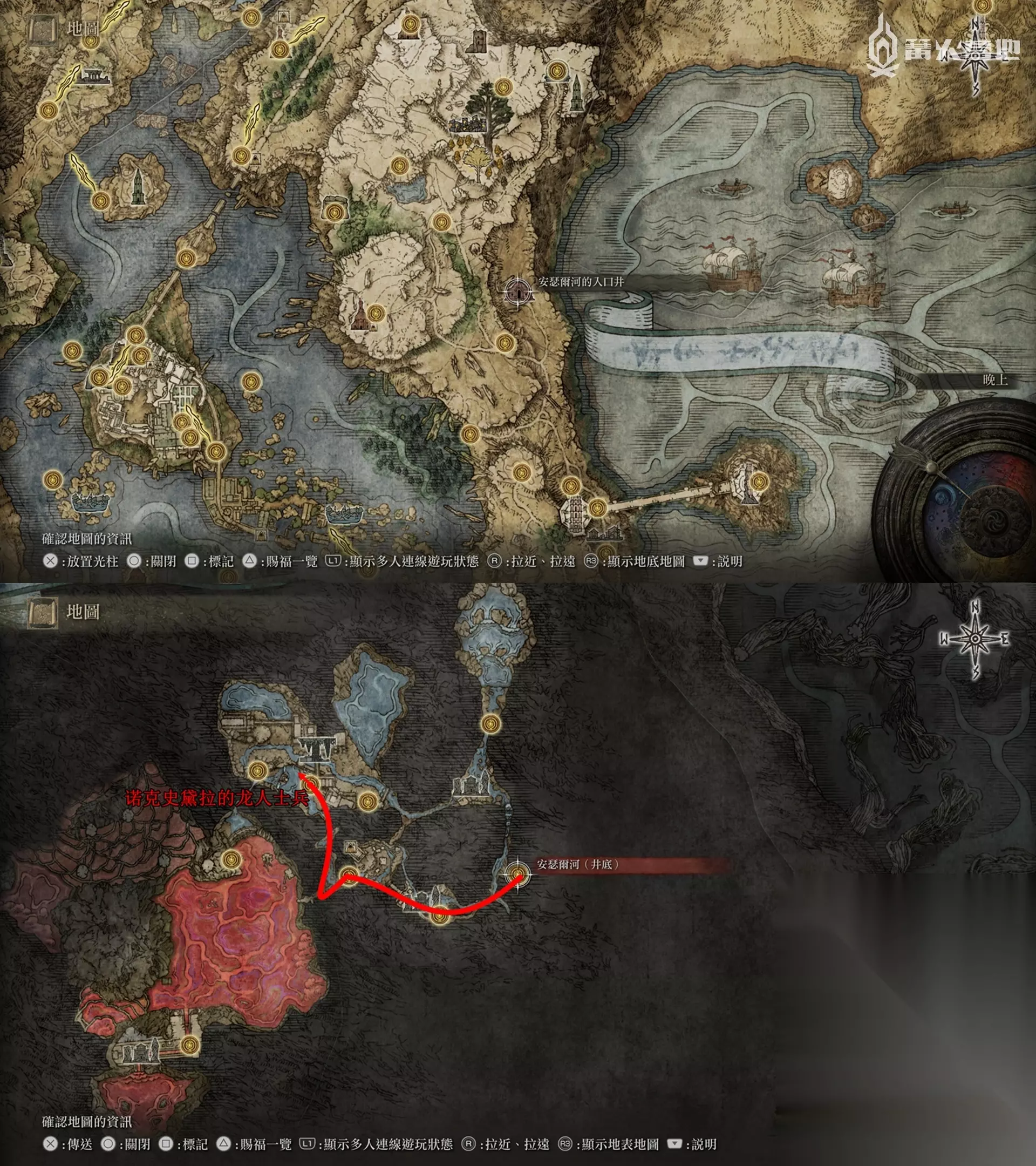封印解开后,回到魔法师塔顶部开宝箱拿到传说魔法 ③「菈妮的暗月」。 找伊吉对话,然后传送到菈妮魔法师塔,出门击杀「“半狼”布莱泽」,回去和伊吉对话选择「布莱泽临终之际」,传送刷新地图,从伊吉这里拿到铃珠和「伊吉镜面盔」。回到赛尔维斯的位置拿到铃珠和魔法教授套装。 从湖之利耶尼亚东边的「安瑟尔河的入口井」来到地下世界,沿着下图路线可以找到Boss「诺克史黛拉的龙人士兵」【Boss 奖杯 / 成就⑮】,它背后的巨人尸体下面的宝箱可以拿到「大朵灵依墓地铃兰」。