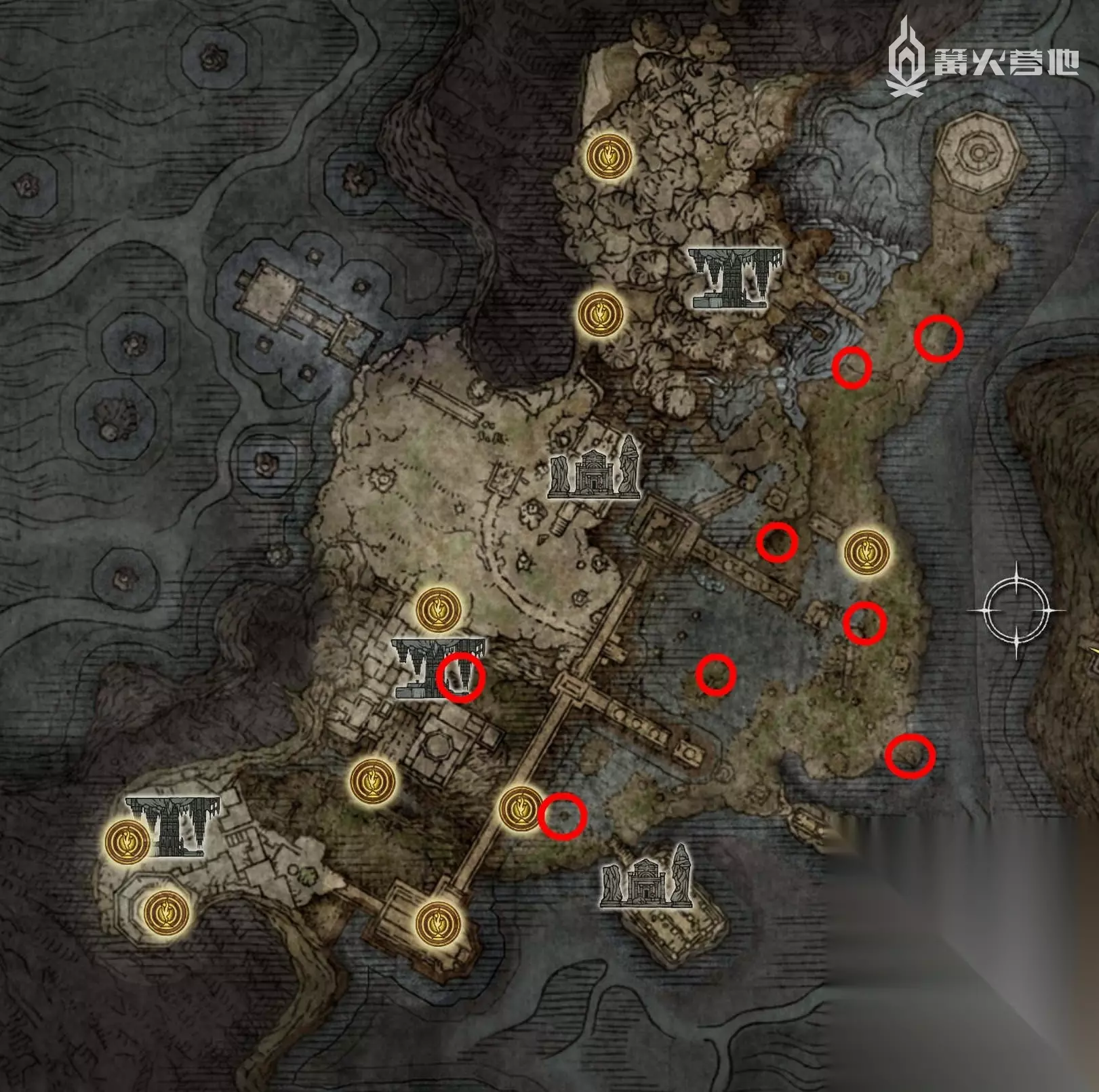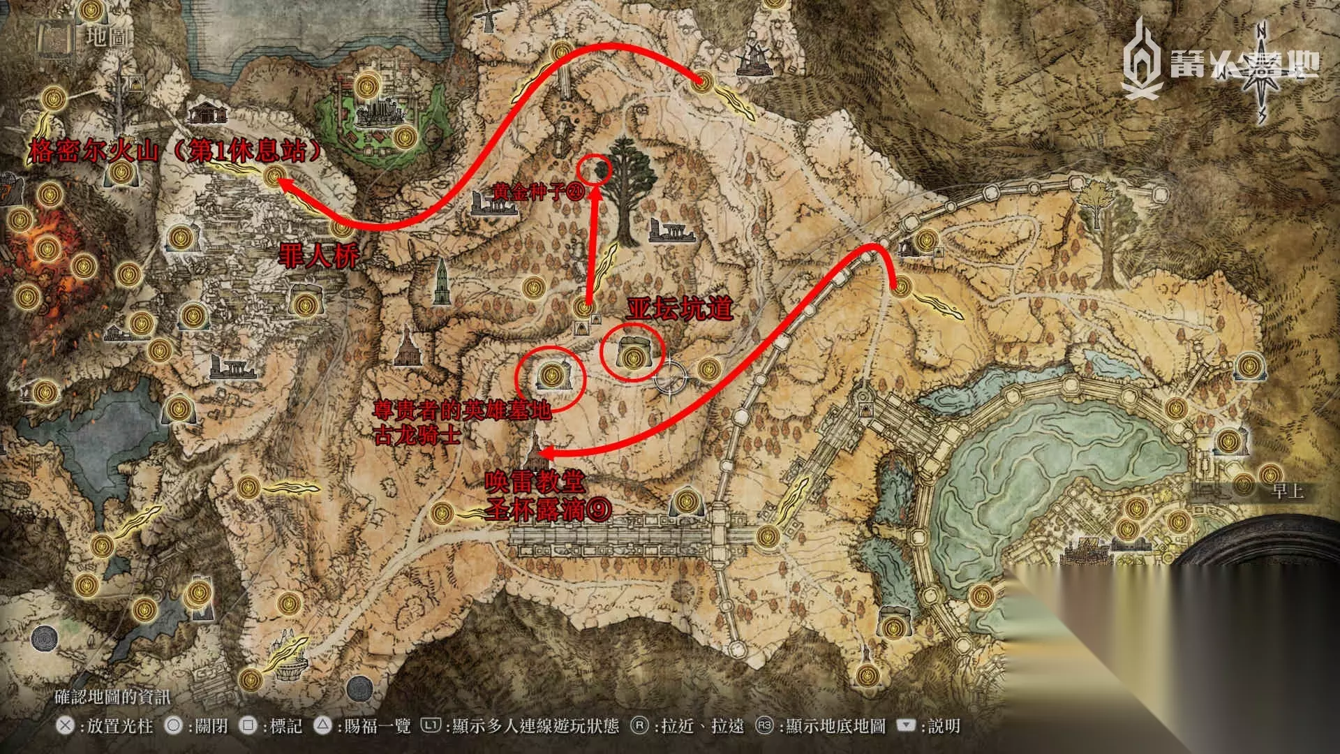 进入王城外围有两条路线可选,一条是从贴着南边那条明显的路直接进入王城外围,有两个大树守卫看着的大门,可以从左边贴着岩壁,躲避巨熊的追打,潜入绕过守卫背后进入大门,里面有一棵小黄金树,能拿到「黄金种子 ⑯」和「黄金种子 ⑰」。继续东北方向沿着大路走,爬上楼梯后可以看到一棵小黄金树,拿到「黄金种子 ⑱」和「黄金种子 ⑲」。 另一条则是从北侧途径风车村,顶着正门的两个投石机的炮火进入王城外围,途中可以看到一棵小黄金树,拿到「黄金种子 ⑳」。但不管从什么路线进入王城外围,最后都需要从北边如图位置,击败 Boss「龙装大树守卫」才能从它背后的门进入王城中。 但要注意,「龙装大树守卫」后边进入王城的门,必须要持有两个大卢恩才能进入,所以需要玩家击杀任意两个碎片君主。按照本攻略的路线,现在已经可以直接进入了,不过我们先不推进到王城内了,回头把其他区域的任务做一做。 首先来到「龙装大树守卫」西北方向的小黄金树,在树下可以拿到重要的「细枝破露滴」,在赐福处调和到灵药圣杯瓶中后,每次使用灵药圣杯瓶,都会保证在之后一段时间内死亡也不会掉落卢恩,Boss 战前喝一口,非常有用。 从赐福「城外战场遗迹」出发,先从西北的大门离开王城外城墙,然后贴着外城墙向西南方向前进,最后来到「唤雷教堂」,拿到「圣杯露滴 ⑨」。从「唤雷教堂」出发往北走来到「尊贵者的英雄墓地」,击败深处的 Boss 可以获得传说骨灰 ②「“古龙骑士”克里斯托福」。 从赐福「穿林大桥」出发,跳下断桥,进入森林中可以看到一棵小黄金树,拿到「黄金种子 ㉑」。 从「风车村」出发,往西边走经过赐福「移送罪人之路(路旁)」「罪人桥」,过桥后右转延左边山崖找到软梯后爬上去,来到「格密尔火山(第 1 休息站)」,赐福东南方向可以发现墓地后岩石上坐在椅子上的尸体,能拿到「失色锻造石 6」。 在亚坛高原的「亚坛坑道」击败 Boss 可以获得「失色石矿工的铃珠【2】」,可以用于购买「失色锻造石 3/4」。