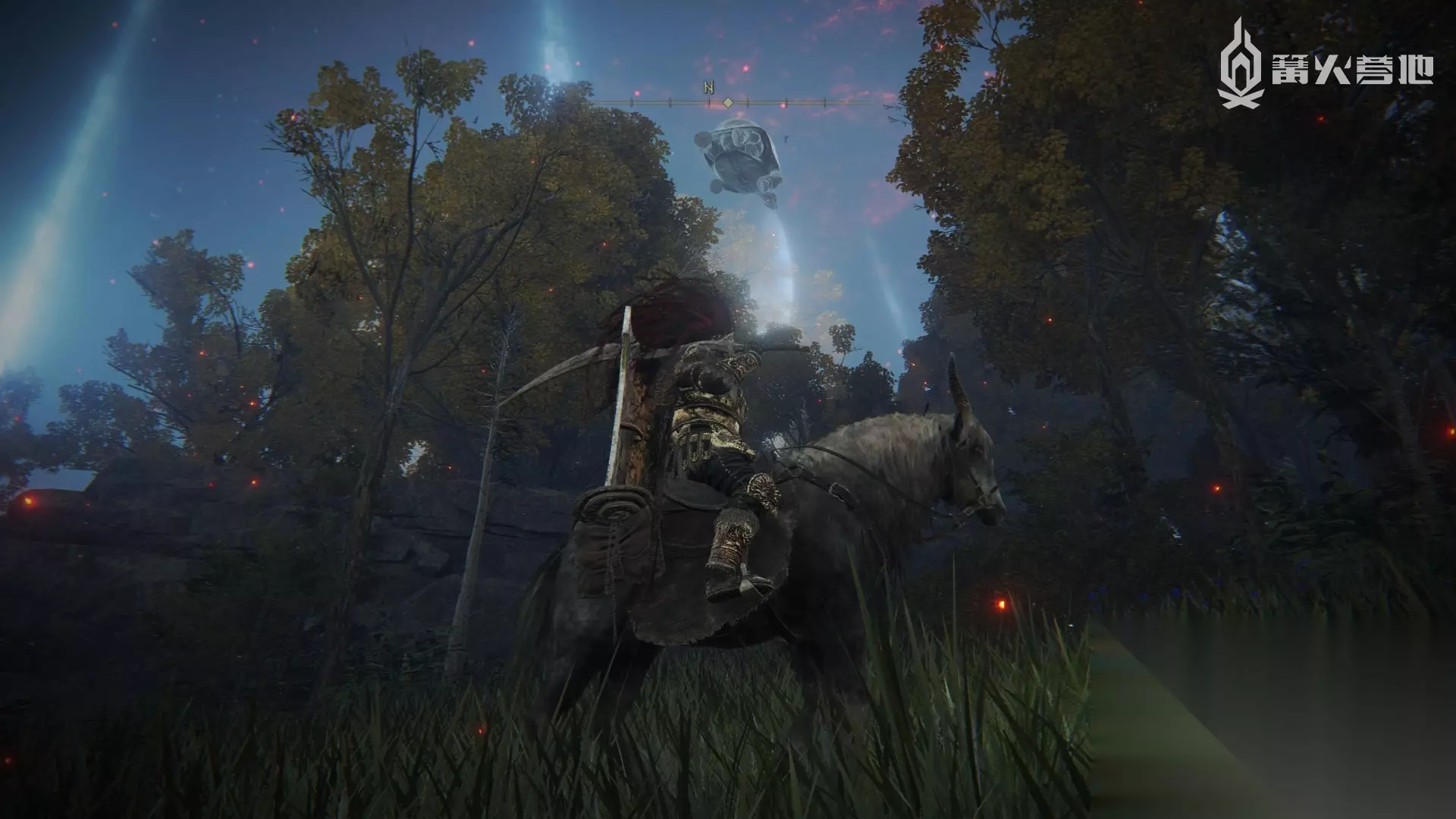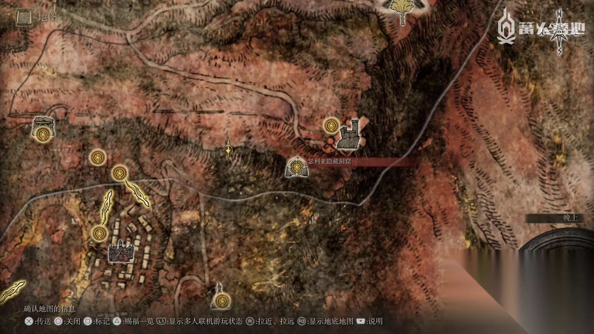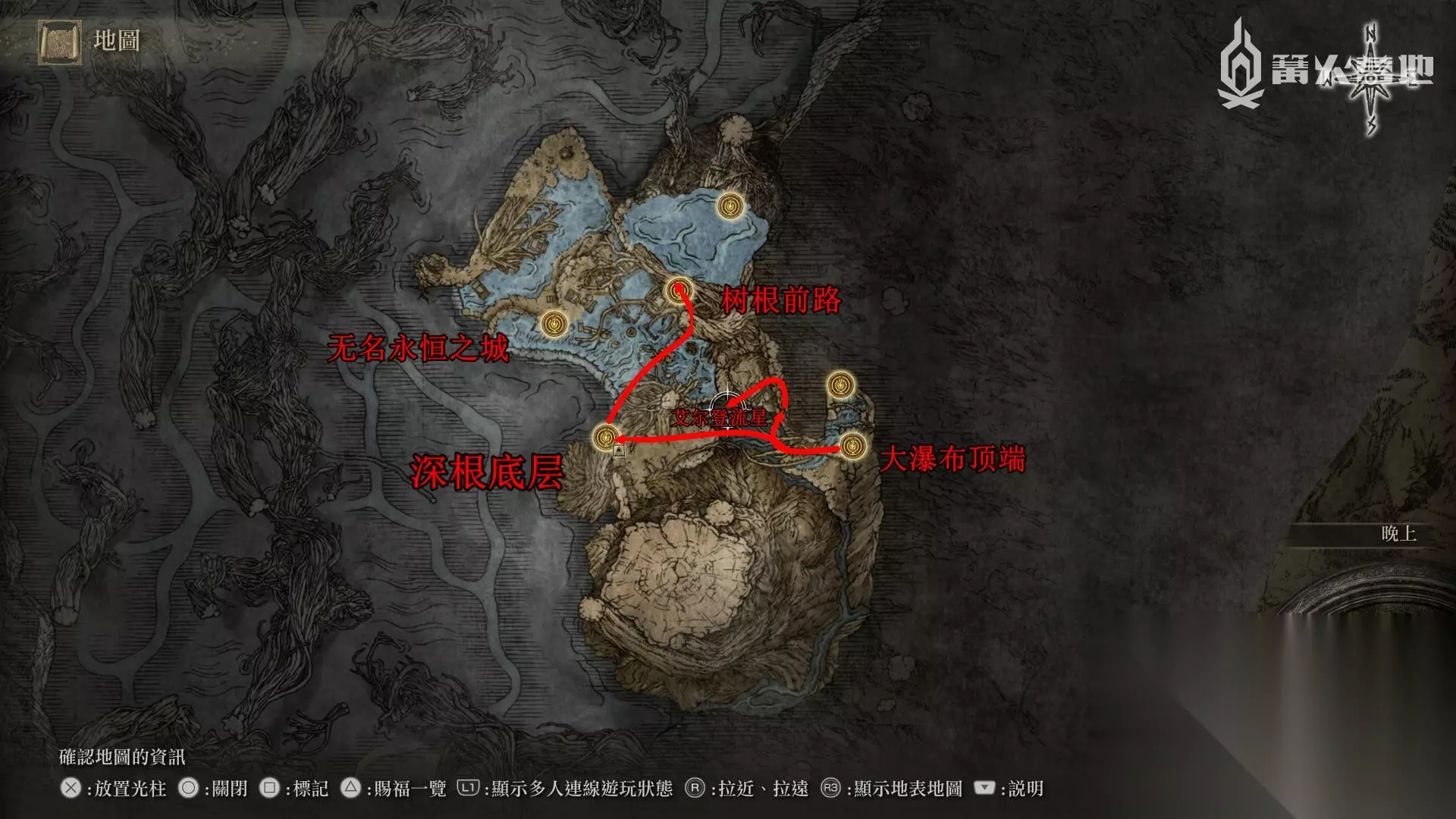在深根底层的赐福「大瀑布顶端」出发,贴着右边的的树干来到一个蚂蚁洞中,可以在出口找到传说祷告 ③「艾尔登流星」。