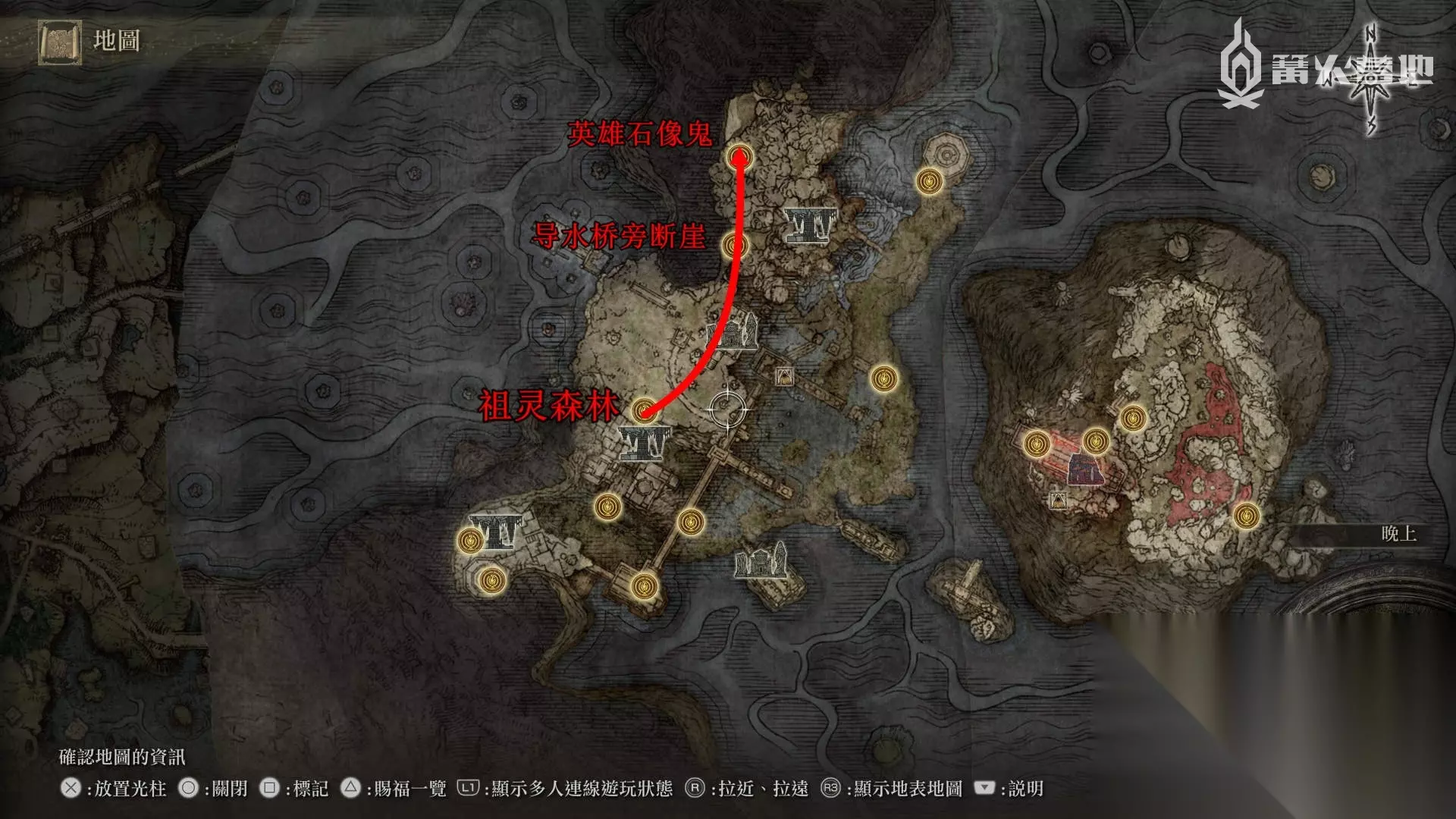 回到诺克隆恩,从「祖灵森林」继续往北走进入有瀑布的宫殿,从赐福「导水桥旁断崖」出发在下图位置可以找到 D 的弟弟,先不用搭理他,击败北边的Boss「英雄石像鬼」【Boss 奖杯 / 成就 ⑯】,通过石棺来到「深根底层」。