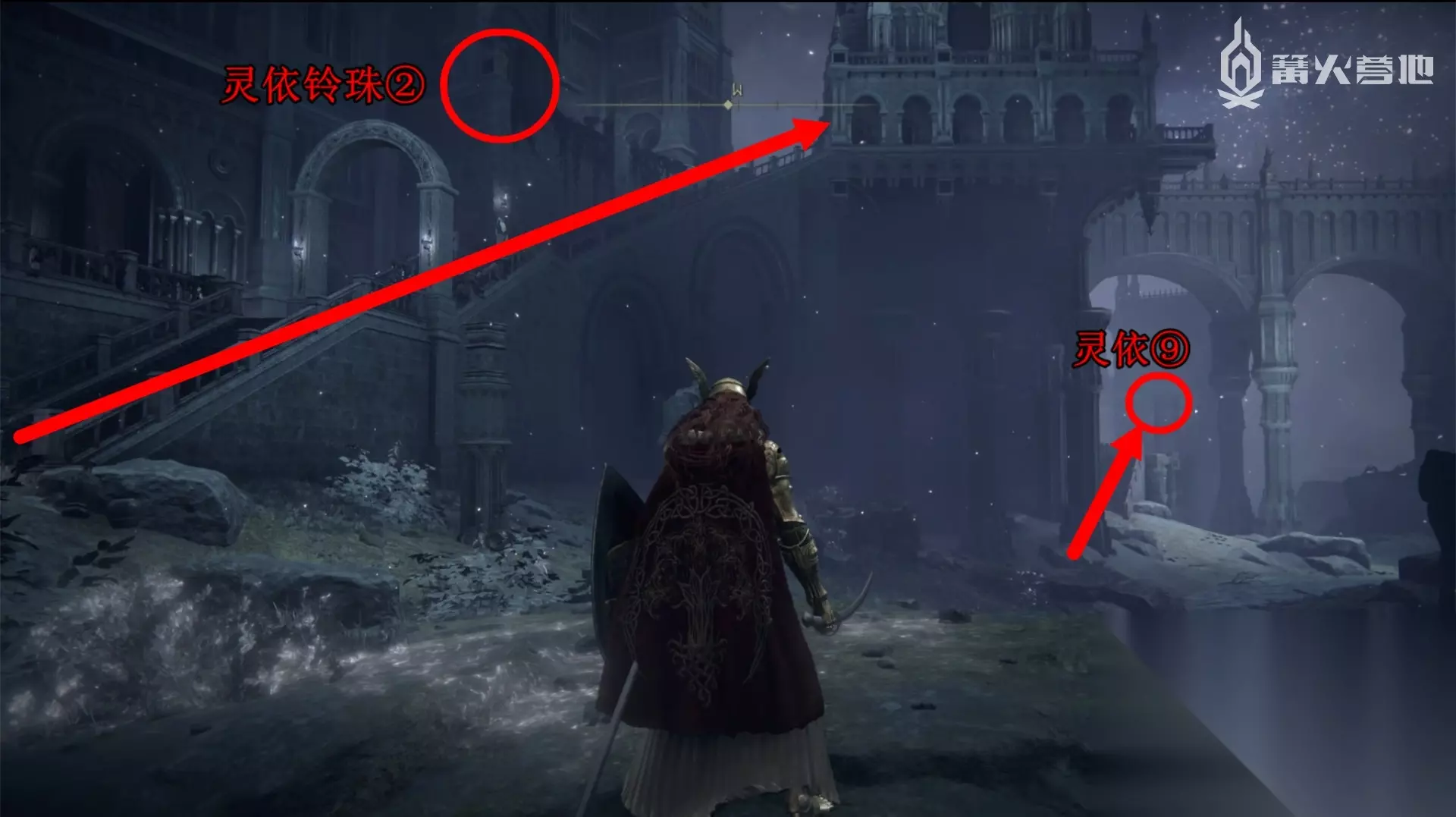 从赐福「祖灵森林」的悬崖跳到对面的楼边来到「黑夜神域」,可以看到靠近赐福「祖灵森林」的下方有个坐在巨石椅子上的巨人尸体,我们的目标就是来到她的椅子下边,从正对巨人左侧的楼顶来到右侧楼内,有一个需要用石剑钥匙开启的雾门,打开里面的宝箱可以获得传说骨灰 ④「仿身泪滴的骨灰」。