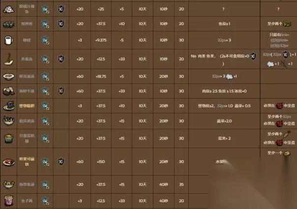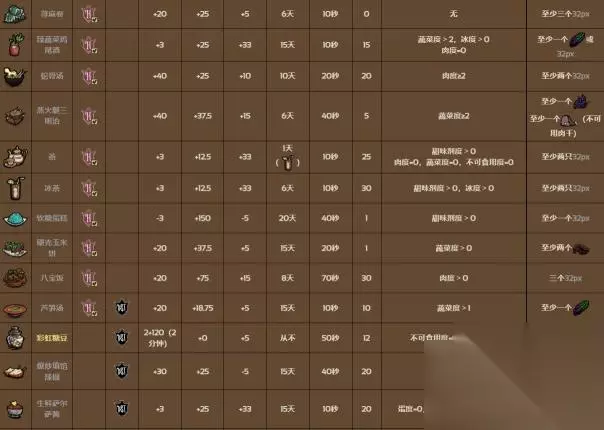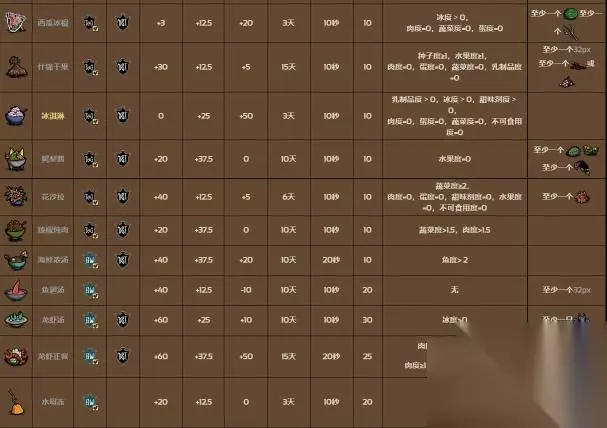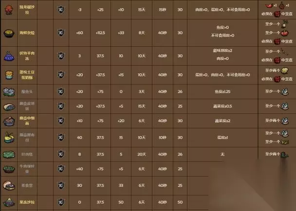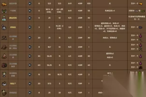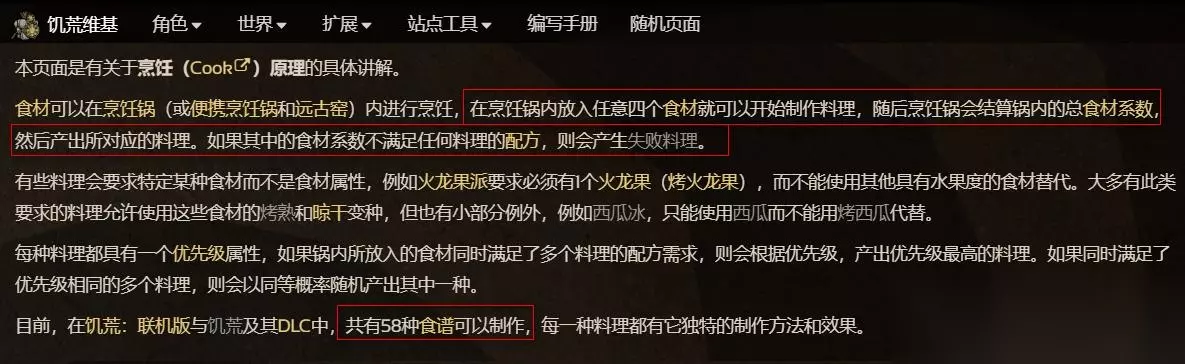 共有58种食谱可以制作,每一种料理都有它独特的制作方法和效果。烹饪锅会结算锅内的总食材系数,然后产出所对应的料理。如果其中的食材系数不满足任何料理的配方,则会产生失败料理。