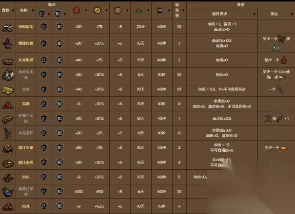 食谱培根煎蛋、蝴蝶松饼、火龙果派、鱼肉玉米卷、鱼排、果酱、蛙腿三明治、水果圣代、蜜汁火腿、蜜汁卤肉、肉串、曼德拉草汤、肉丸的配方如下图所示: