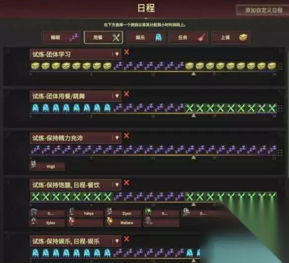 WYY 前中期食物匮乏,狼人只让吃老鼠地鸦,活灵好养活只吃脏梅,乌鸦高贵得吃能给的最好的饭防止崩溃,人类和支璃人前期吃苦粥中期吃甜粥,后期食物多了再山珍海味。WYY 然后有的学生试炼指点吃某种食物再另外设置。WYY 日程模块:WYY 晚上会来怪,所以建议中午睡觉,日程会优先执行最上方的日程,所以一些需要团体活动的两试炼日程放最上面,平时不用团体日程。WYY