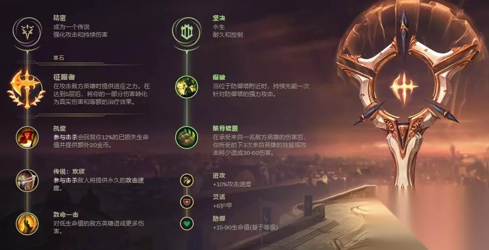 主系精密,征服者为基石符文,凯旋+致命一击是上单战士的标配,能够将其的输出提升到最大。副系坚决系爆破+骸骨镀层,目的是为了提升克烈的持续承伤能力。属性碎片提供1进攻+2防御。 出装推荐