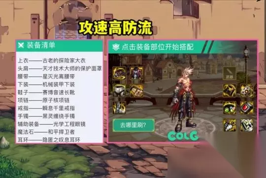 【二】攻速回血流 在攻速流高伤害低防御的基础上,牺牲一点伤害,加入三件高防御装备,“天才护肩、瞬息千里戒指、和平捍卫者右槽”,提升生存能力,避免和巴卡尔见面就挂树的尴尬,适合红队和黄队大佬,具体出装如下: 【古老的探险家大衣/蓝灵出血上衣、天才技术大师的保护面罩、星灭光离腰带、机械装甲下装、赛博音速长靴、原子核项链、瞬息千里戒指、黑灵缠绕手镯、光学工程眼镜/自定义左槽、和平捍卫者、隐匿之叹息耳环/自定义耳环】