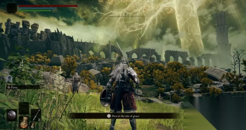 游戏界面 HP量表 当下的HP(生存的力量)。受到伤害时会减少,归零时即为死亡。在赐福休息、使用红露滴圣杯瓶,或是运行祷告都可以恢复HP。 FP量表 使用战技及魔法所需的力量。施放战技及魔法时会减少,归零时,即无法施放战技或魔法。在赐福休息或是使用蓝露滴圣杯瓶都可以恢复FP。 精力量表 当下的精力。精力用尽时,无法再进行任何需消耗精力的动作。精力会随时间逐渐恢复,另外,不在战斗状态时,便不会消耗精力。 状态图案 当特殊效果发动时,例如能力加成,会显示对应的状态图案。 方位条 显示方位。死亡后,遗留卢恩的位置及地标也会显示于方位条上。 敌人HP 敌人的HP(生存的力量)。