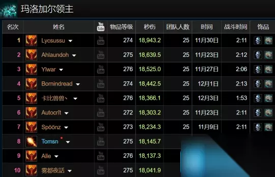 另外,惩戒骑、野德和火法分列第3到第5位。其他职业的排名跟全部百分比排名大差不差,而且后面的差距都比较小,没有前两名这样的断崖式。 全Boss伤害前十情况 接下来,我们再看看各大Boss目前的输出前十究竟都是什么职业霸占。 1、玛洛加尔领主 狂暴战刷屏了,前十里面占据了9个位置,只剩下一名火法排行第八。