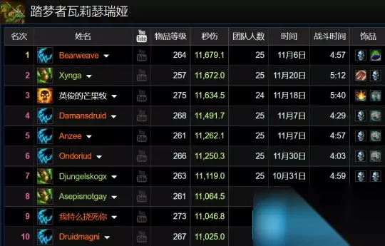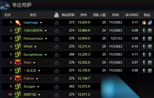 11、辛达苟萨 猎人优势Boss,生存猎占据7个席位,不过第一却是火法,另外还有2名狂暴战