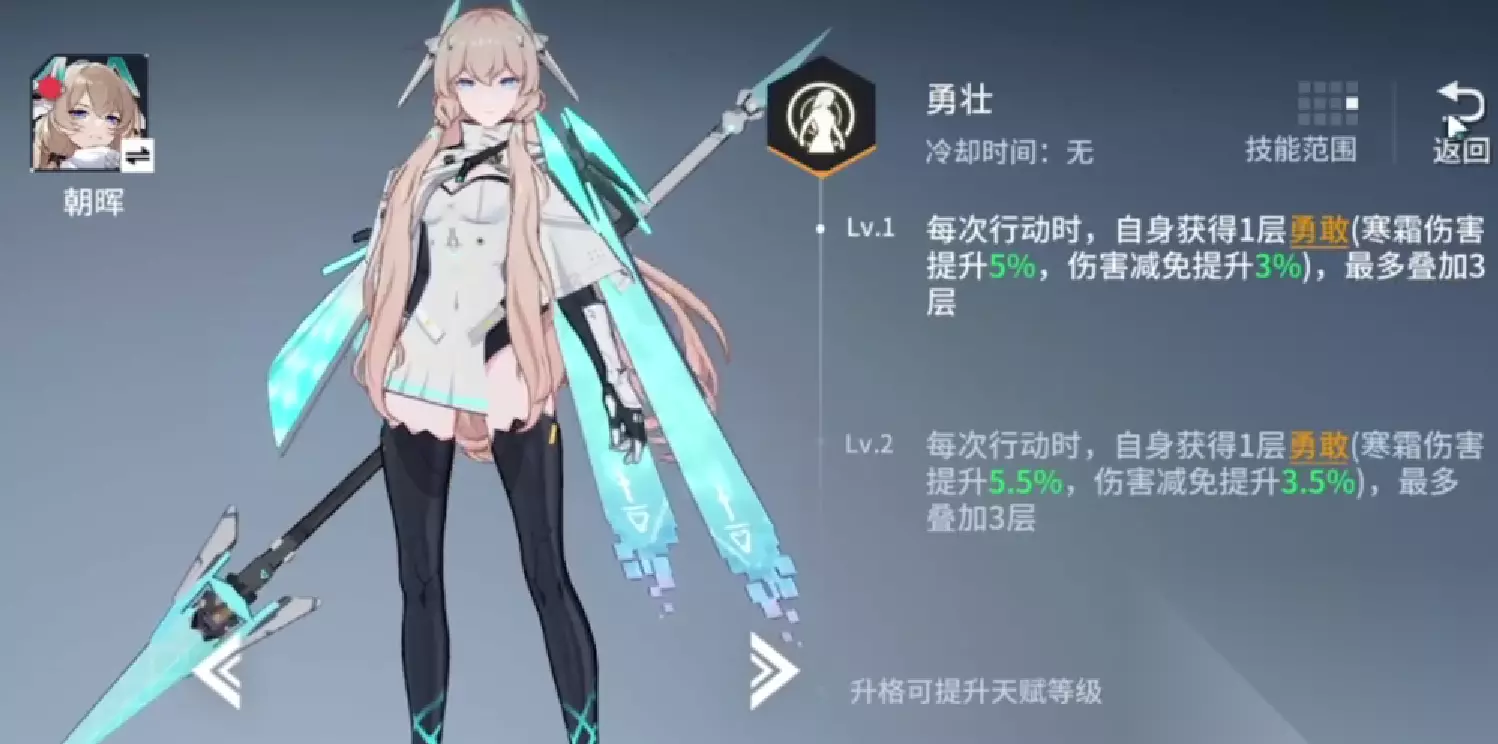 朝晖,作为冰系第二位输出单位,相比于冷蛟采用群体大范围输出为主,朝晖则更加倾向于单体的输出能力。而且角色本身技能buff方面自带于免伤和输出提升效果,这使得应对一些pve副本当中的强力boss敌人有着极大的发挥作用,甚至于某些极端情况下可以单刷某些boss。且自带一定的范围输出能力,以及对次要目标的伤害打击效果,值得培养。