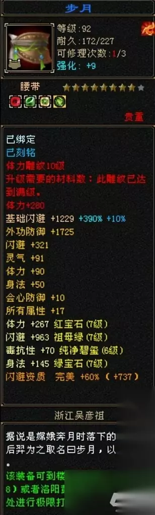 而这样强悍的面板,必然是有强大的装备和宝石支撑。 除了减抗是6级之外,其余宝石都是7级,9级强化,10级雕纹,装备全部带身法!